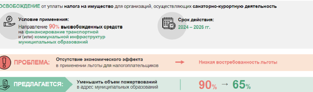 Данная мера поддержки освобождает санаторно-курортные организации от уплаты налога на имущество при условии, что не менее 90% суммы от этой льготы будут безвозмездно переданы в бюджет муниципалитета на развитие транспортной и коммунальной инфраструктуры. Льгота была предусмотрена на три налоговых периода, начиная с 1 января 2024 года.