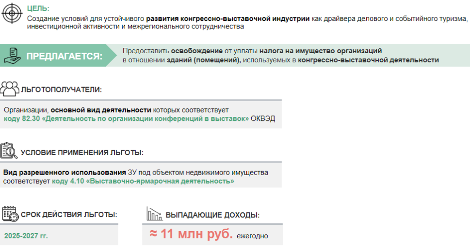 Дополнительная потребность в площадях в Пермском крае составляет 40 тыс. кв. м. При этом проекты не привлекают инвестиции, поскольку требуют большой объём расходов на их строительство и содержание. По этой причине предлагается на 2025-2027 годы ввести льготу по налогу на имущество для владельцев конгрессно-выставочных площадок.