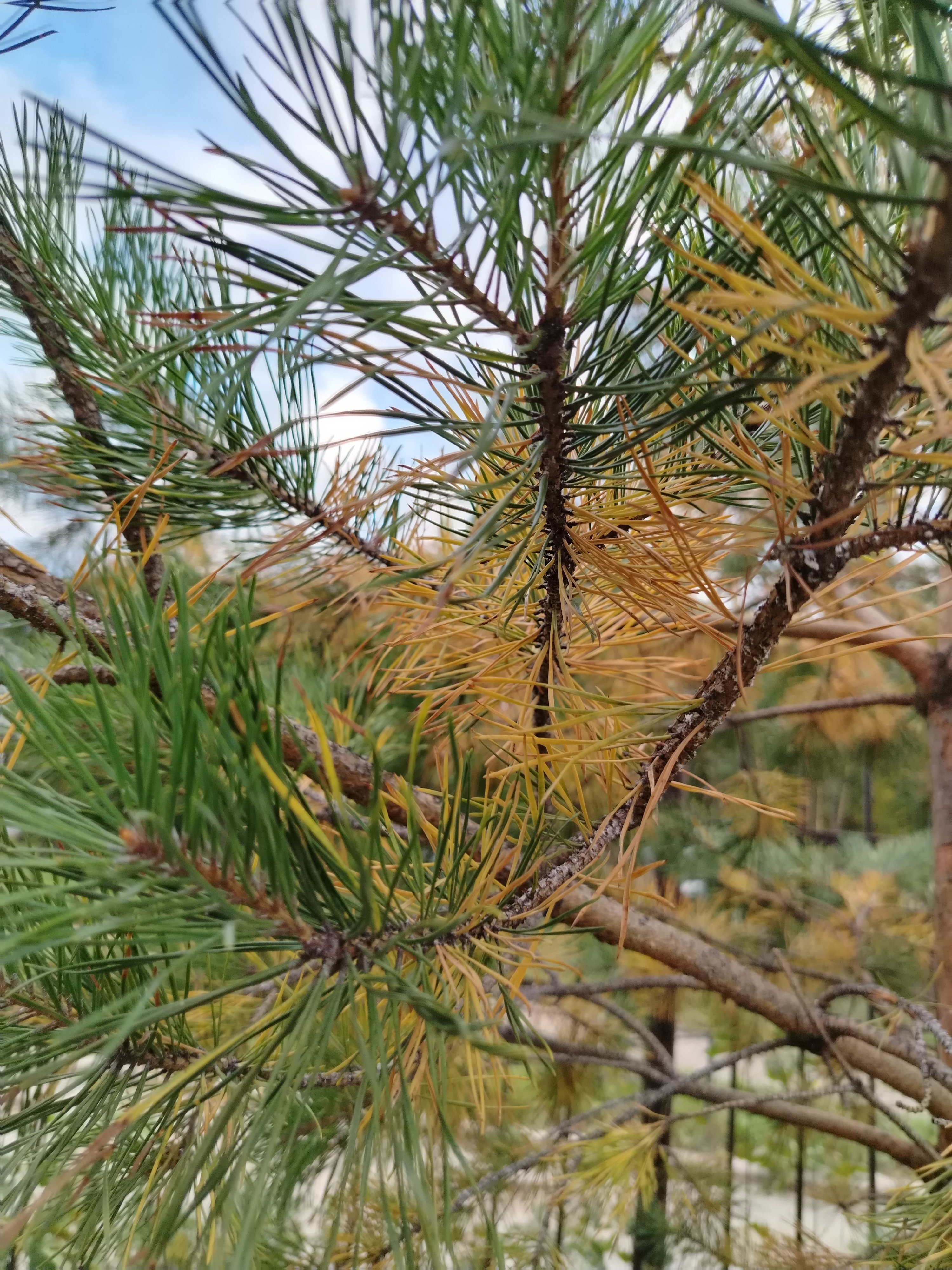 Хвоя на деревьях желтеет и опадает