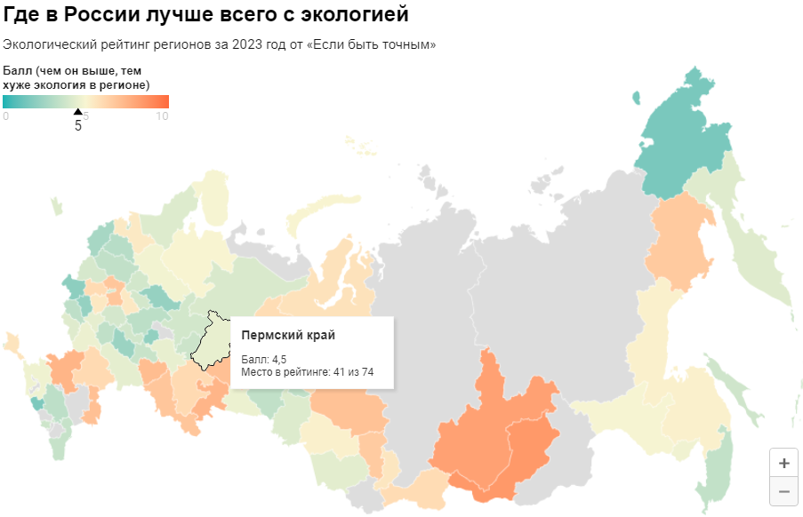 В рейтинг по состоянию экологии в целом вошли только 74 региона, по 11 субъектам РФ у Росгидромета не оказалось информации о наблюдениях за чистотой воздуха. Прикамье в этом рейтинге оказалось на 41 месте, набрав 4,5 балла (чем выше балл, тем хуже экология).