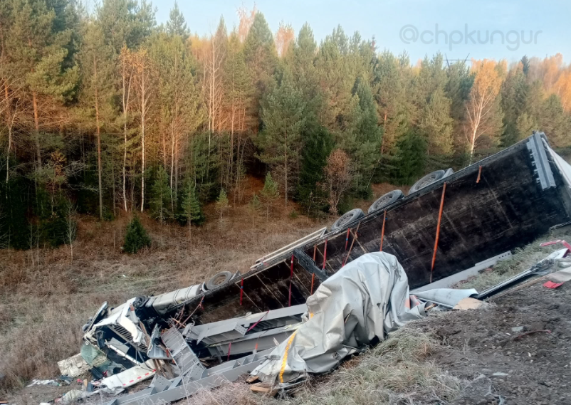 Как выяснилось, водитель грузовика не справился с управлением и съехал с дороги, после чего фура опрокинулась.