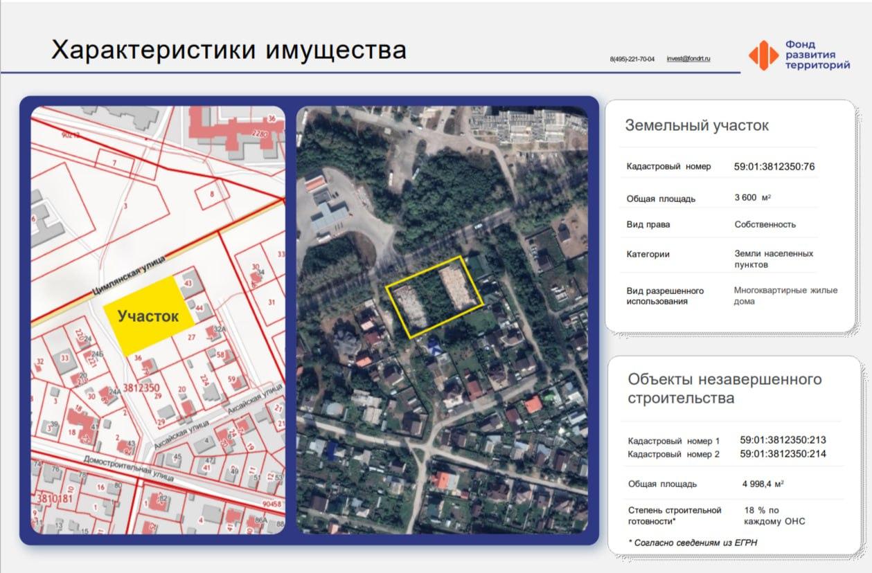 Как отметили в минстрое Пермского края, ФРТ планирует выставить на торги ещё 7 аналогичных участков в Прикамье. Ранее уже было продано 7 земельных участков с объектами незавершенного строительства, что дало возможность начать преобразование заброшенных территорий и частично вернуть в краевой бюджет средства, направленные на восстановление прав дольщиков.