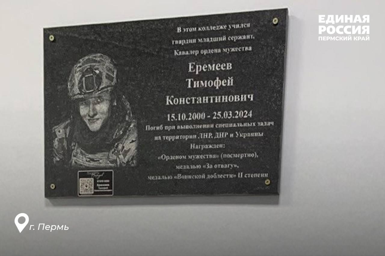 На здании Пермского нефтяного колледжа появилась мемориальная доска в память о его выпускнике Тимофее Еремееве, погибшем в 23 года в ходе СВО. Об этом сообщили в Пермском отделении партии «Единая Россия».