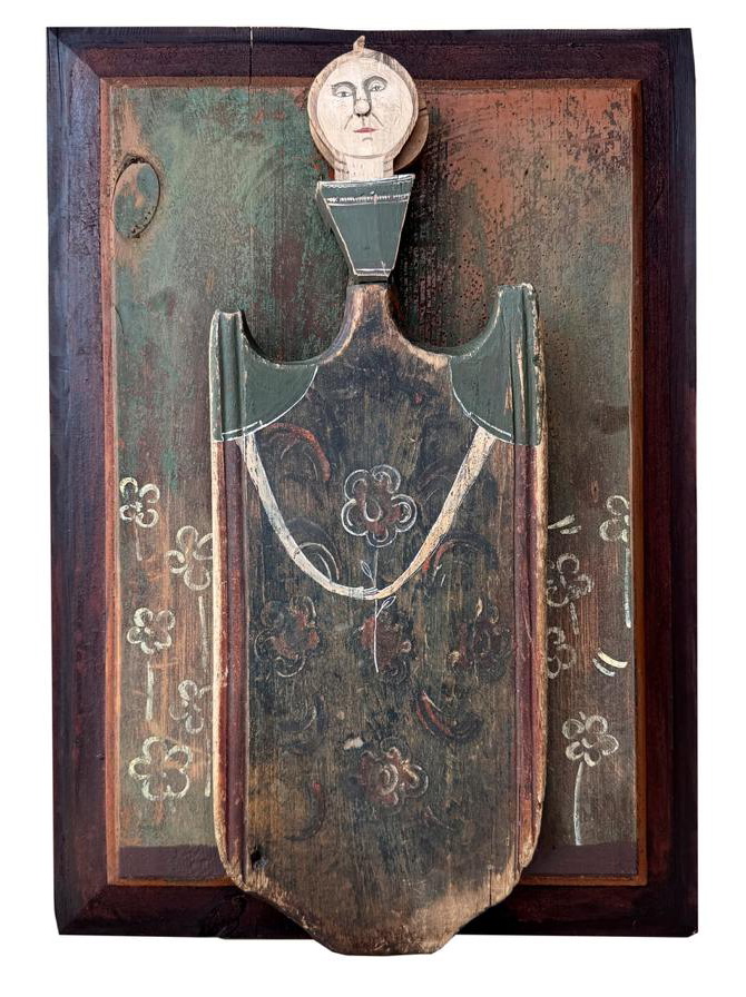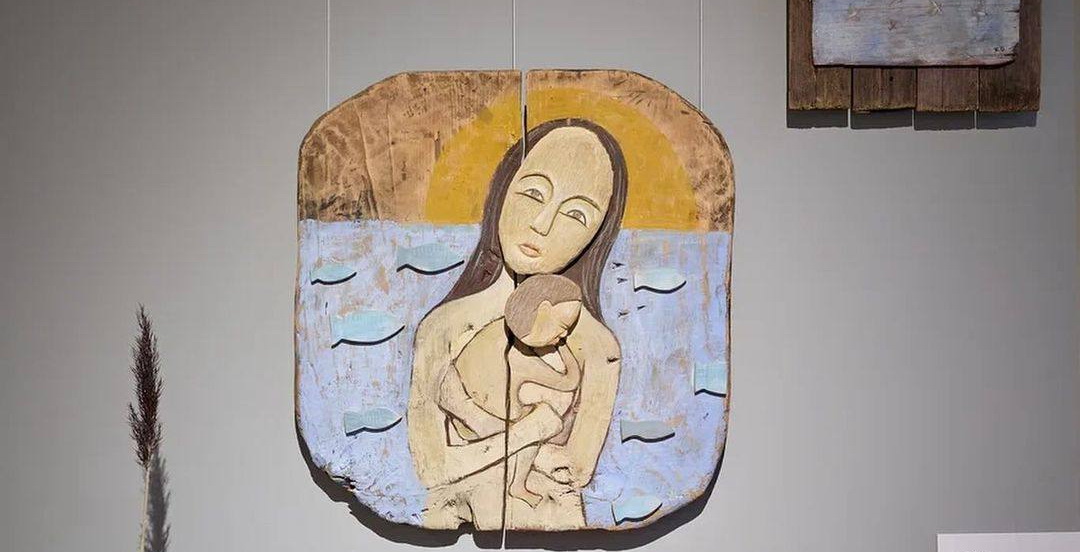 «Работа «Мадонна» художницы Жени Балдиной из пермских Березников. Материалы: двухсотлетнее вековое дерево (крышка от зерновой бочки), акрил, резьба по дереву. Была выставлена и куплена на выставке современного русского дизайна «Трын*Трава».