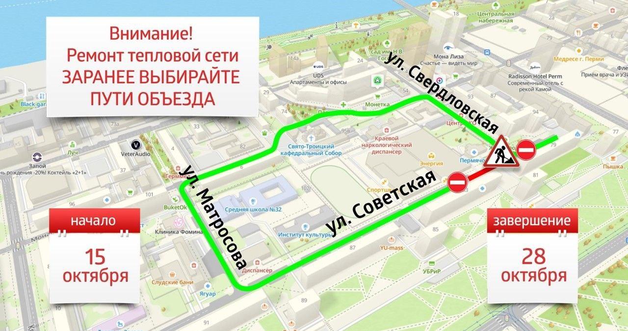 В Перми из-за ремонтных работ на участке теплотрассы с 15 октября движение по ул. Советской вблизи пересечения с ул. Свердловской полностью перекрыто в обоих направлениях. Об этом сообщили в пресс-службе сетевой организации.