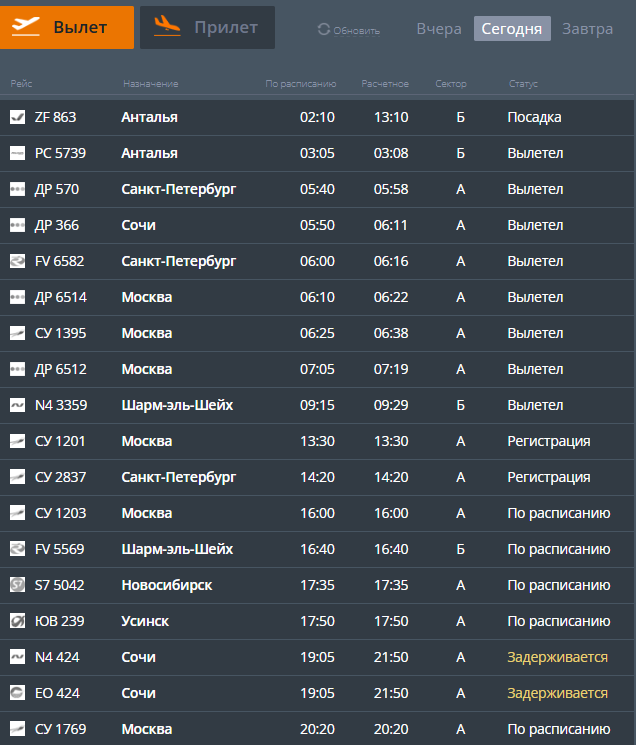 Согласно данным онлайн-табло аэропорта, задерживается рейс из Перми до Сочи компании Nordwing Airlines — его перенесли с 19:05 на 21:50. Рейс авиакомпании «Икар», который должен был отправиться в Сочи в 19:05, перенесён на 21:50.