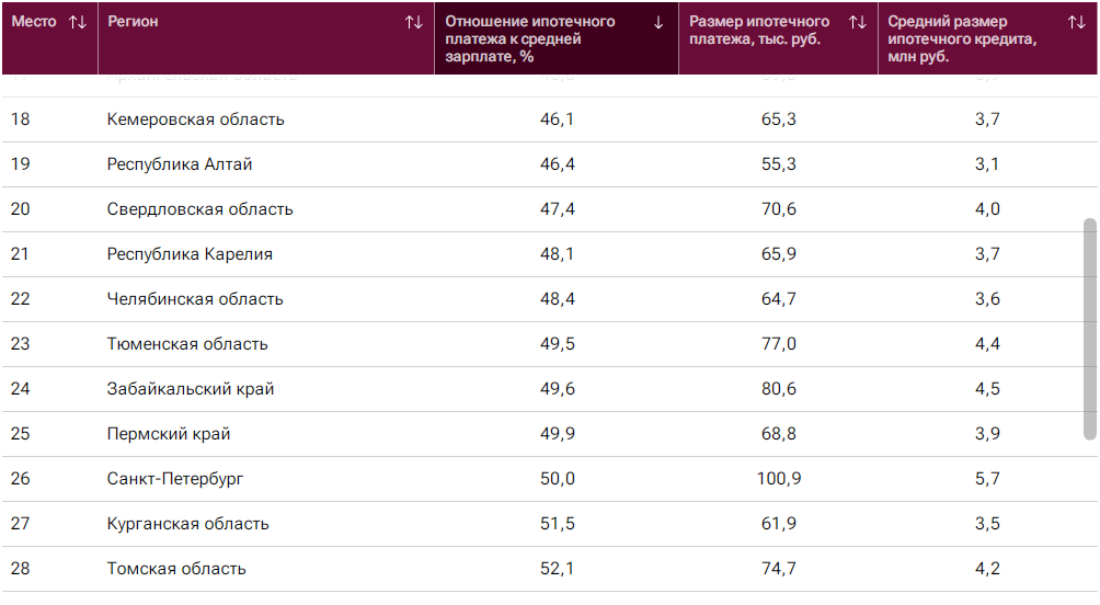 Последние строчки заняли Калмыкия (114,8%), Северная Осетия (87,3%), Дагестан (84,8%), Крым (80,5%) и Адыгея (76,8%). Москва оказалась на 15 строчке (44,5%, + 11 позиций), Петербург — на 26-й (50%, +3 позиции), Свердловская область — на 20-й (47,4%, +1). Средний показатель по России соотношения ипотечного платежа к двум зарплатам — 48,8%.