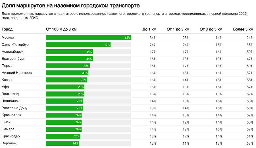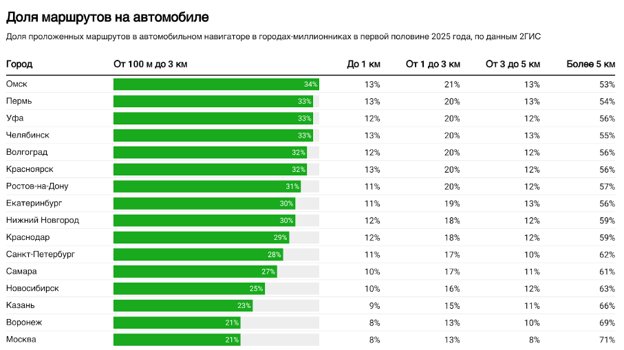 Меньше всего таких маршрутов в Москве и Воронеже — по 8%. Аналитики связывают это с развитием платных парковок, городского транспорта, каршеринга, аренды электросамокатов и велосипедов.