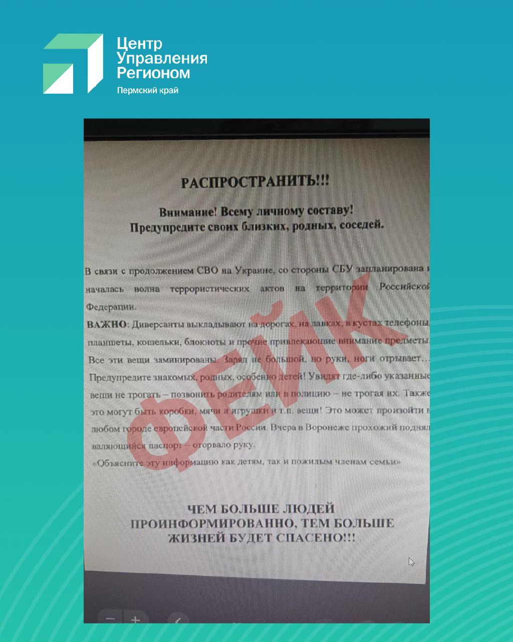 Министерство территориальной безопасности Пермского края опровергло данную информацию, назвало документ фейком и призвало жителей региона не поддаваться панике и доверять только официальным источникам.