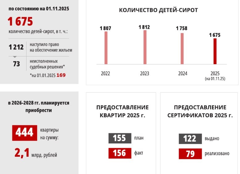 С 2023 года наблюдается тенденция к снижению числа детей-сирот. Так, в 2023 году их было 1812 человек, в 2024-м — 1758, а в этом — 1675.