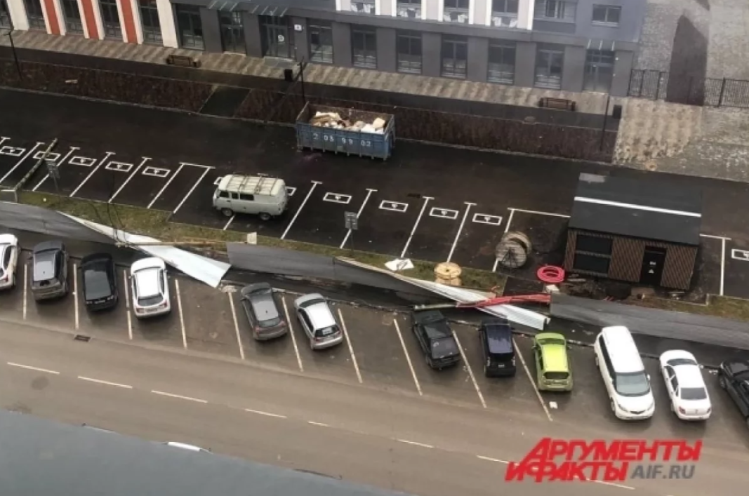 Под весом конструкций листы металлопрофиля обрушились на землю рядом с припаркованными автомобилями. О повреждениях машин очевидцы не сообщили. Местные жители считают, что причиной происшествия стал сильный ветер, который поднялся в районе жилого комплекса.