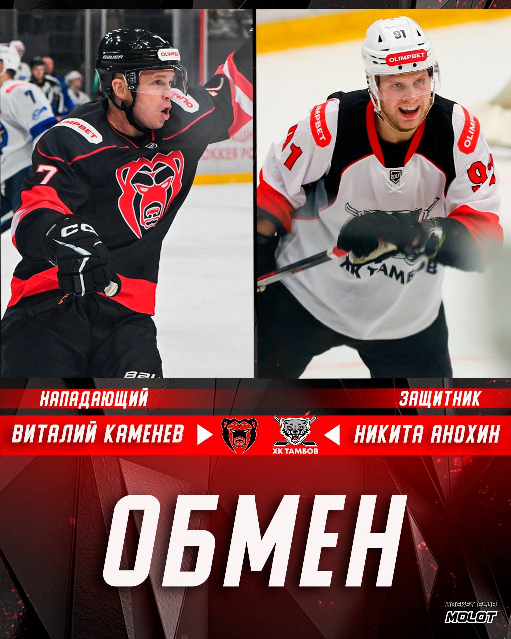 ХК «Молот» и ХК «Тамбов» провели обмен игроками. В результате нападающий Виталий Каменев перешёл в «Тамбов», а защитник Никита Анохин пополнил состав пермского клуба, сообщает пресс-служба «Молота».
