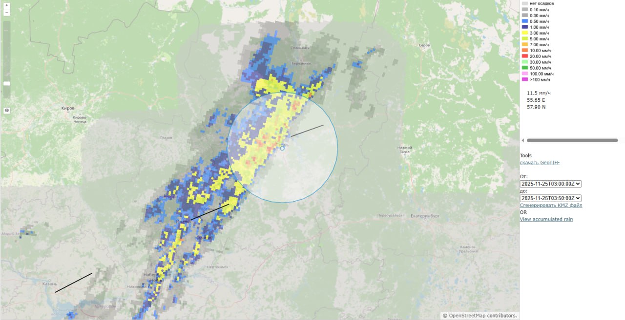 На холодном фронте наблюдаются осадки с максимальной интенсивностью до 31 мм/ч, однако их продолжительность будет кратковременной — около получаса.