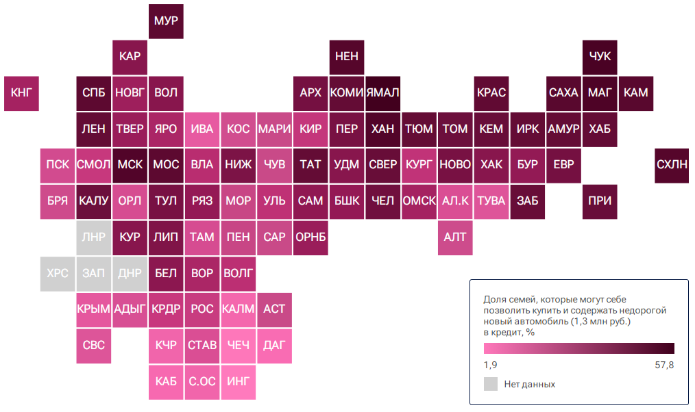 Большая доля семей, которые могут себе позволить средний по стоимости автомобиль, оказалась в ЯНАО (29,1%), Чукотском АО (25,2%), Магаданской области (20,2%), Москве (20,2%) и Ненецком АО (17,3%). В Пермском крае это могут себе позволить только 4,7% семей. Менее доступны такие машины также для жителей Ингушетии (0,6%), Чечни (0,7%) и Дагестана (0,9%).