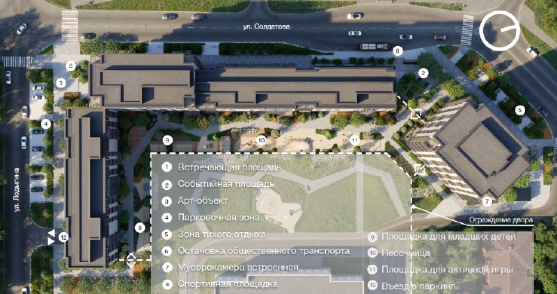 Дом появится на перекрёстке улиц Солдатова и Лодыгина, будет состоять из шести секций переменной этажности — 9, 11 и 16 этажей. На первом этаже со стороны улицы предусмотрят коммерческие помещения для медицинских организаций, салонов красоты или небольших заведений общепита. На первом этаже со стороны двора предусмотрят квартиры с террасами, террасы в виде патио (с крышей и двумя проёмами) будут также построены в квартирах на верхних этажах.