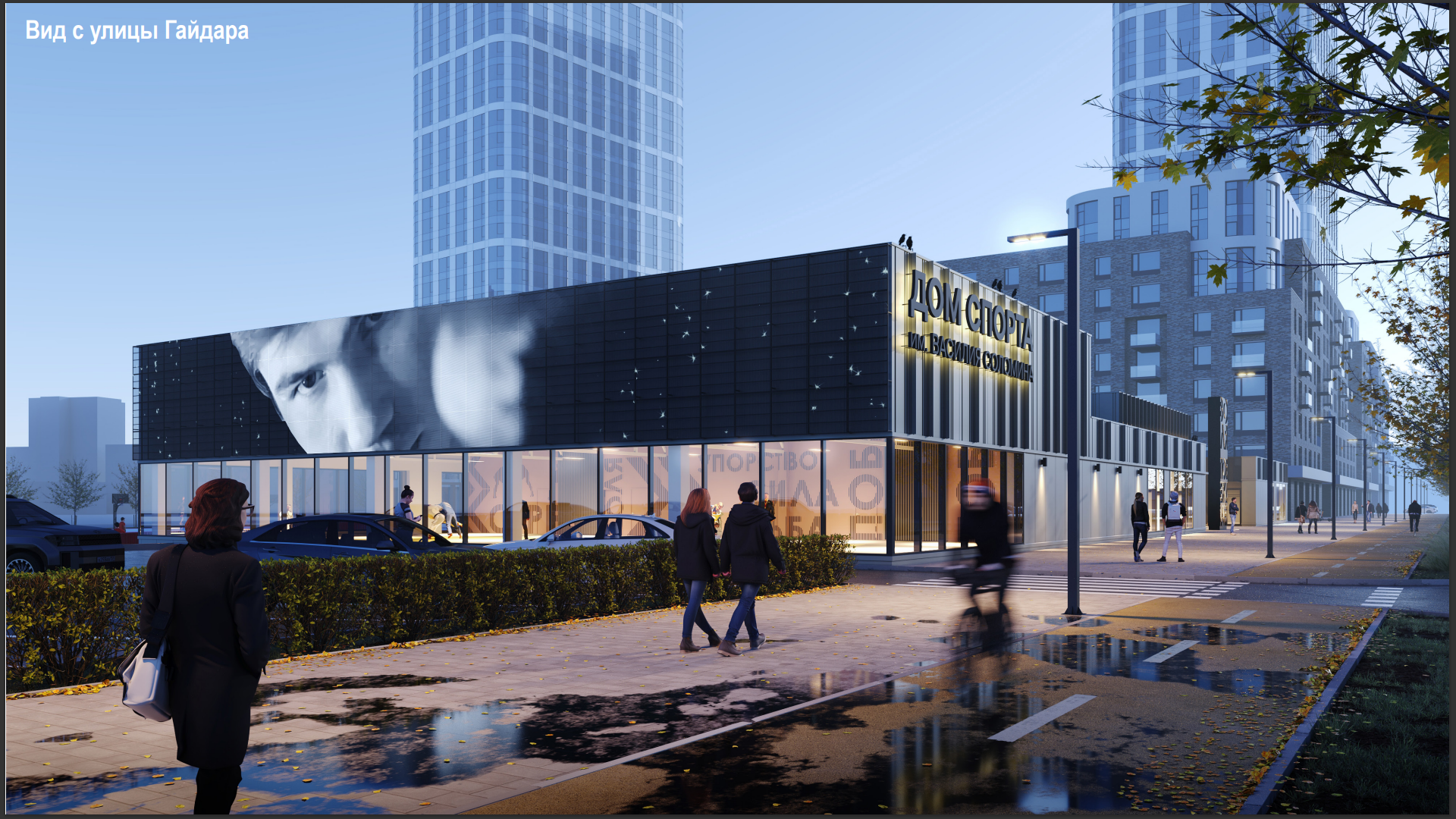 Основной фасад и главные выходы будут обращены к ул. Гайдара. Сам объект будет выполнен в лаконичных, сдержанных цветах, фасады выполнены из тёплого витражного остекления и объёмных фасадных панелей. Доминирующим архитектурным элементом станут пандусы ярко-красного цвета со стороны открытых площадок.