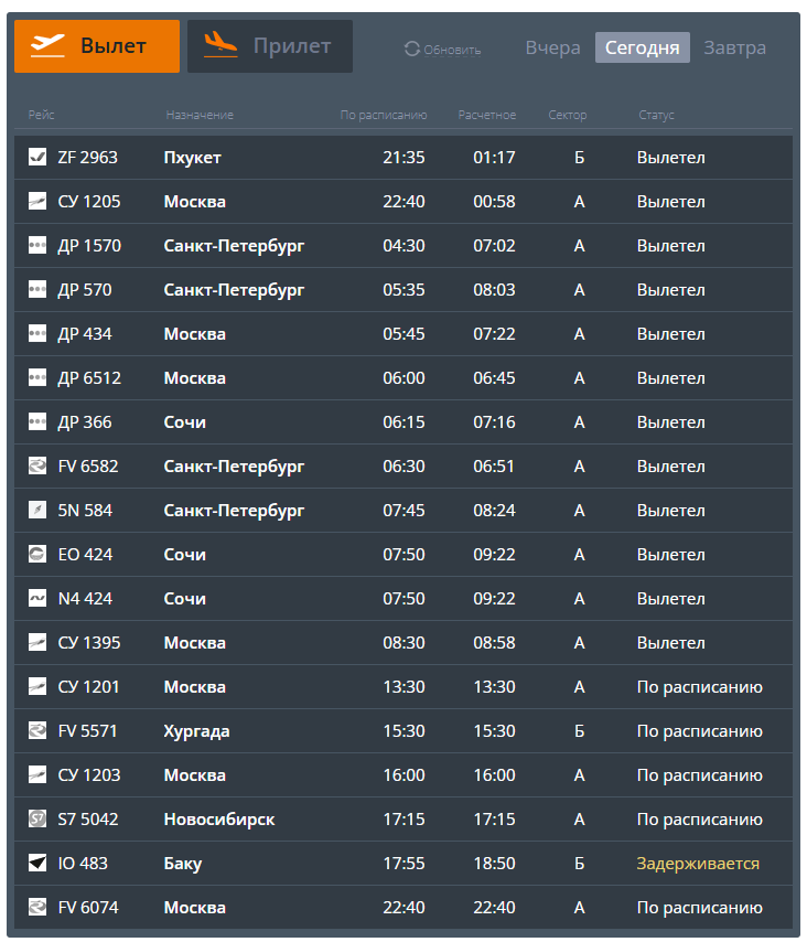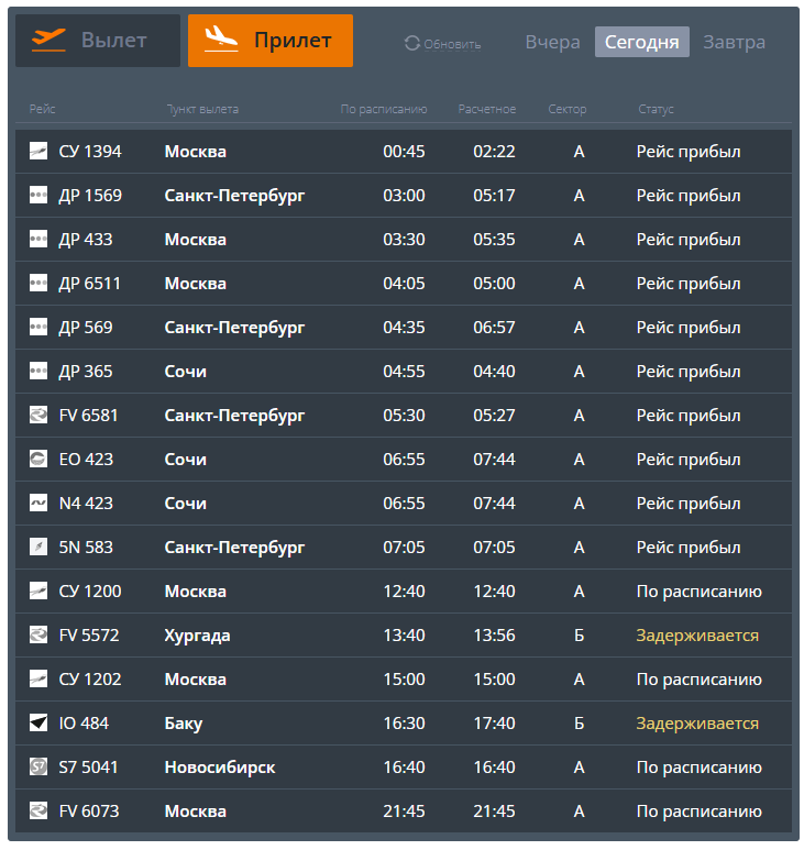 На данным момент с опозданием в Перми ждут рейсы FV 5572 из Хургады (обслуживается авиакомпанией «Россия») и IO 484 из Баку (авиакомпания «ИрАэро»). Рейс из столицы Азербайджана прибудет в краевой центр в 17:40, с задержкой на 1 час 10 минут.