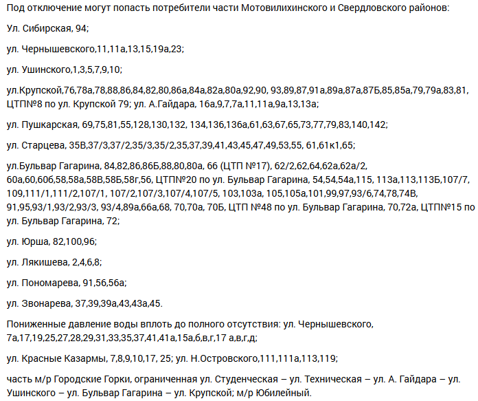 Отмечается, что при отключении будет организован подвоз воды автоцистерной. Местонахождение машины с водой можно утончить по тел. 210-06-80 или call@novogor,perm.ru.