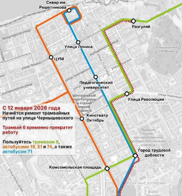 С 12 января в Перми начинается реконструкция трамвайных путей на ул. Чернышевского. Как сообщили в департаменте транспорта администрации города, запланирована полная замена балласта и рельсошпальной решётки, реконструкция контактной сети, строительство новой остановки на пересечении с ул. Карла Модераха.