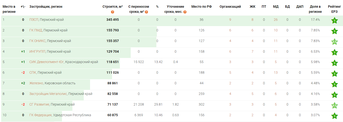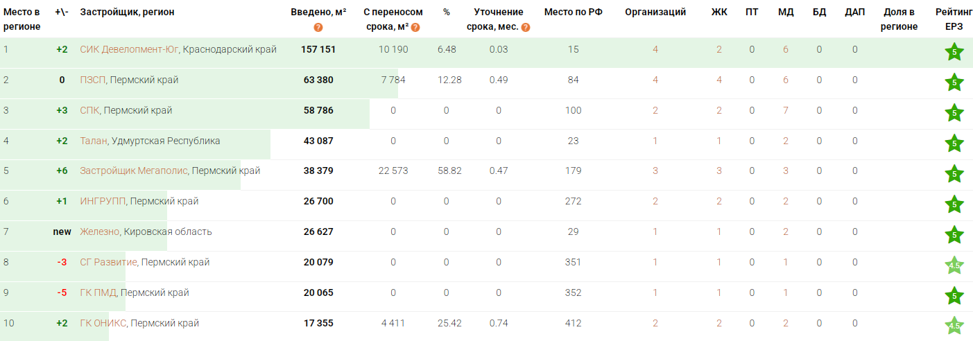 В топ-5 также вошёл «Ингрупп» (Пермский край) — 129,7 тыс. кв. м (6,53%), 158-е место в общероссийском рейтинге. И СИК «Девелопмент-Юг» (Краснодарский край) — 118,6 тыс. кв. м (5,98%), из них 15,9 тыс. кв. м с переносом срока сдачи, в общем рейтинге компания занимает 55-е место.