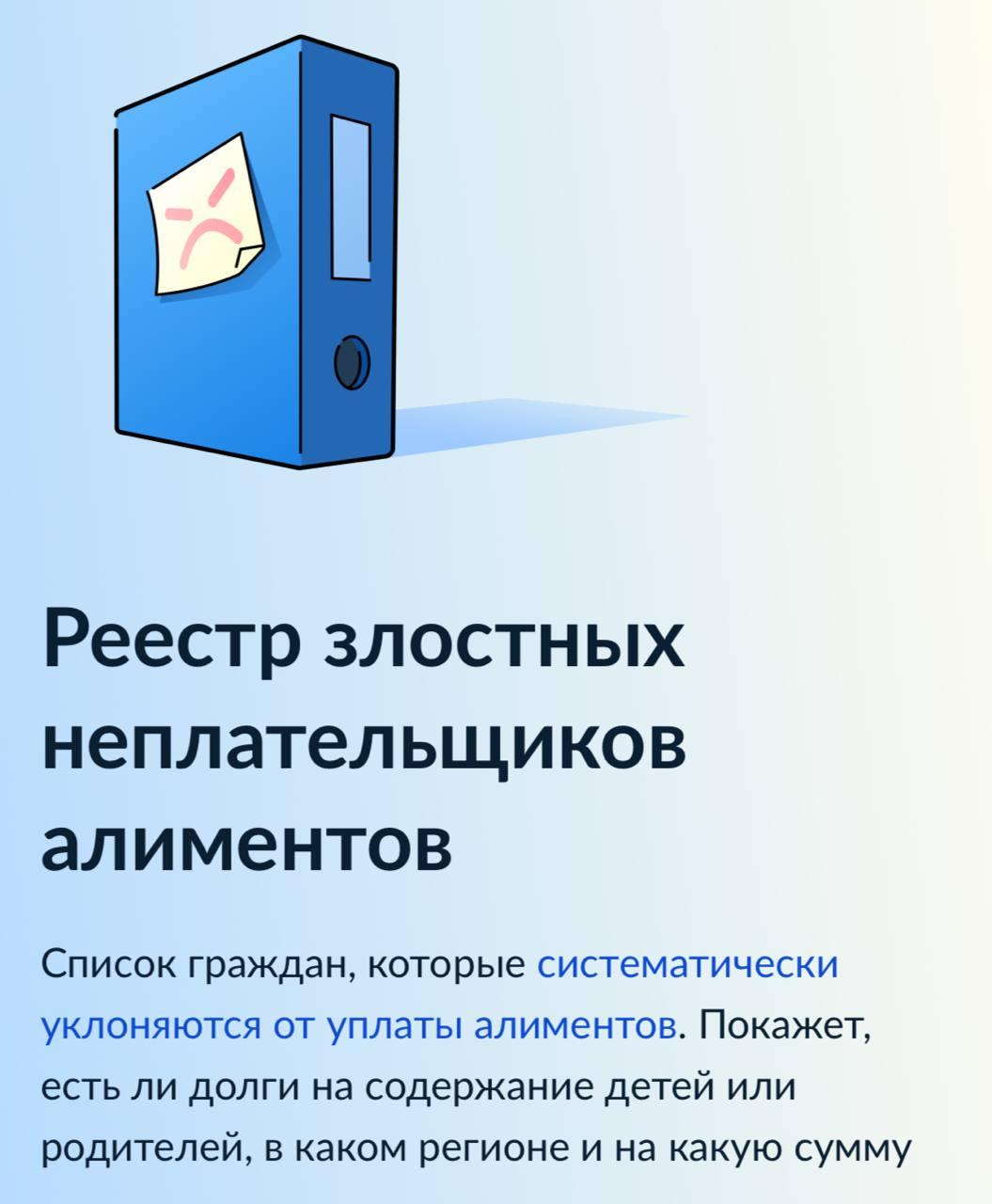 «Узнать, есть ли у человека долги по алиментам на содержание детей или родителей, в каком регионе и на какую сумму, теперь можно на Госуслугах. На портале появился реестр злостных неплательщиков алиментов», — говорится в сообщении.