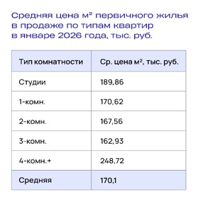 Согласно информации от аналитического сервиса для застройщиков «Объектив.РФ», к середине января 2026 года средняя цена квадратного метра на рынке новостроек Перми составила 170,1 тыс. руб. За год стоимость квадратного метра увеличилась на 11,7% — в январе 2025 года этот показатель был равен 152,3 тыс. руб.