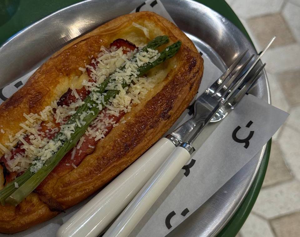 В меню пока нет завтраков и дневных позиций, но есть богатая витрина десертов и выпечки, некоторые позиции представлены только на этой точке, например слойка с беконом и спаржей.