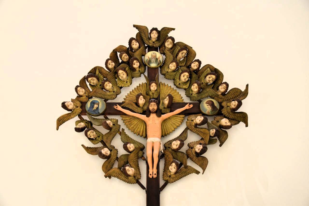 Специалисты отмечают необычный вариант иконографии сюжета «Распятия». Вокруг креста — 34 херувима, каждый вырезан отдельно и смонтирован на металлические пластины, образующие двойной ромб. Ангелы словно парят, создавая ощущение движения и особой торжественности композиции.