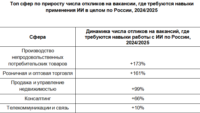 Кандидаты сами проявляли высокий интерес к вакансиям с акцентом на ИИ: по стране в лидерах по росту откликов оказалась отрасль производства товаров народного потребления (непищевых) (+173%). За ней следует сфера торговли в розницу и оптом с приростом в 2,6 раза (+161%). Тройку замыкает рынок недвижимости — здесь отклики на ИИ-вакансии увеличились вдвое (+99%).
