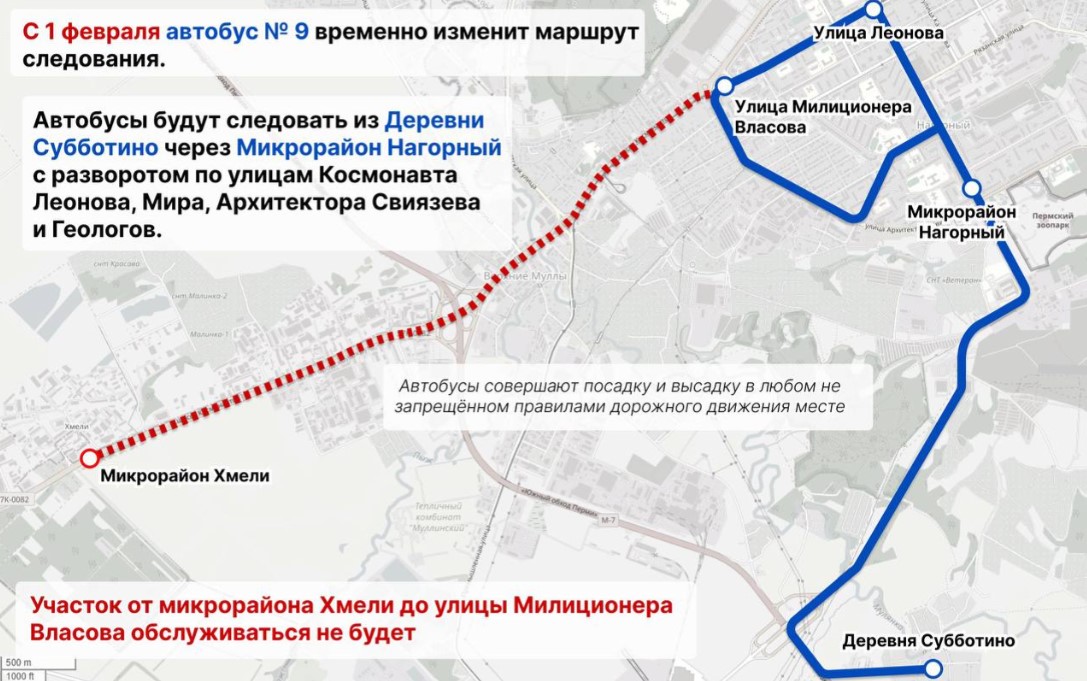 Маршрут №9 на время перестанет обслуживать микрорайон Хмели. Вместо этого автобус начнет свой путь из д. Субботино, совершая разворот на улицах Леонова, Мира, Свиязева и Геологов.