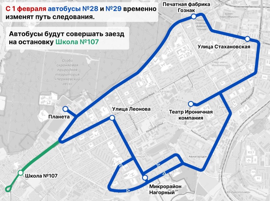 Автобусы №28 и 29 будут заезжать на остановку «Школа №107» и разворачиваться на кольце у ул. Оверятской.