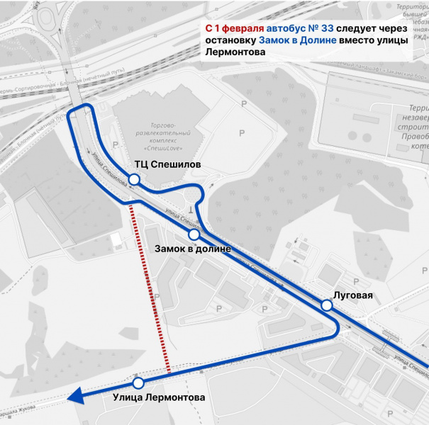 Как сообщает администрация Перми, автобусы № 33 будут ходить чаще. Чтобы пассажирам было легче пересаживаться на автобусы, следующие по ул. Спешилова в направлении центра города, в путь следования включат остановку «Замок в Долине». При движении транспорта в сторону остановки «Город Сердца» после остановки «Торговый центр «Спешилов» автобусы проследуют под путепроводом до остановки «Замок в долине» на другой стороне ул. Спешилова, затем повернут на ул. Маршала Жукова.