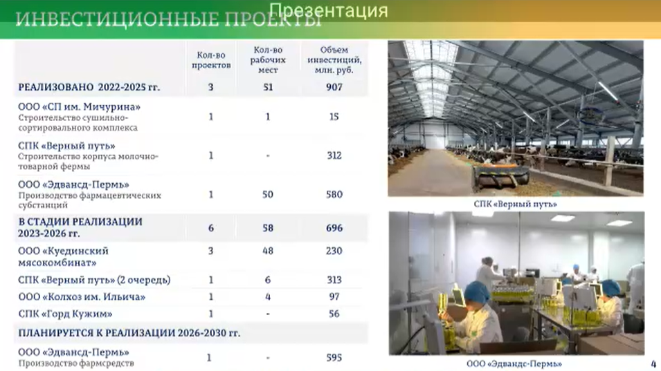 Ранее, с 2022 по 2025 годы, в территории было реализовано три крупных инвестиционных проекта: ООО «СП им. Мичурина», СПК «Верный путь» и ООО «Эдванс-Пермь».