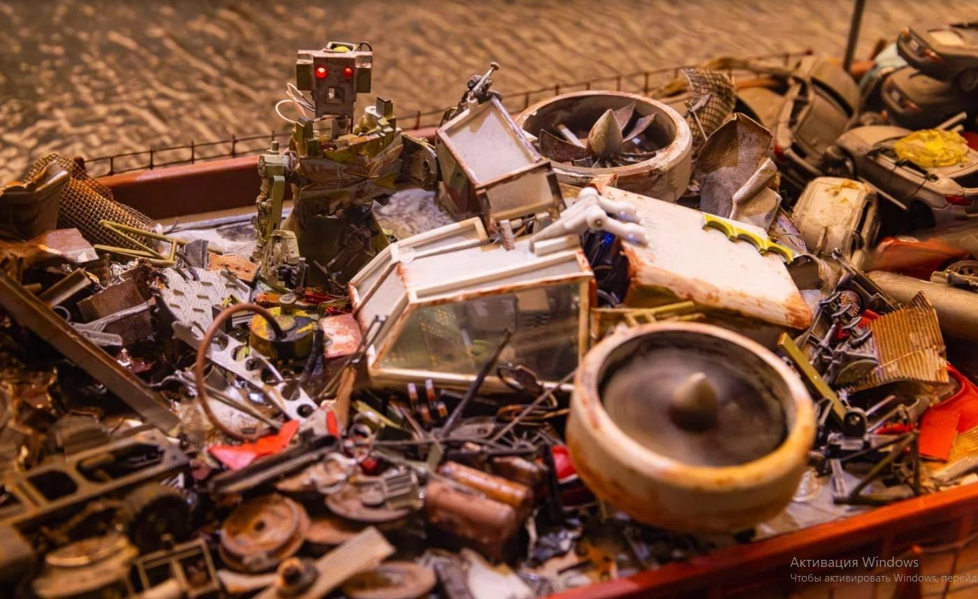 В миниатюрной версии буксира можно увидеть также десятки ржавых автомобилей. «На барже располагается одна из особенностей музея-диорамы — интерактивная сценка с национальным персонажем — роботом Виталиком, который после нажатия посетителем кнопки на макете начинает запускать мини-самолёт», — говорится в информации.