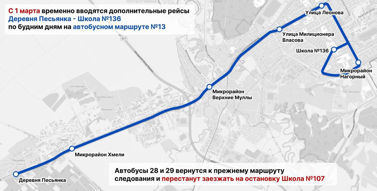 «С 1 марта временно на автобусном маршруте № 13 по будням вводятся дополнительные рейсы «Д. Песьянка — Школа № 136». Для их обозначения под лобовым стеклом автобусов будет установлена соответствующая табличка», — отметили в мэрии.