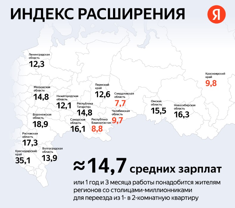 «Яндекс.Недвижимость» представил "индекс расширения", который позволяет оценить, насколько легко можно переехать из однокомнатной квартиры в двухкомнатную в различных регионах России. Этот индекс рассчитывается с помощью нейросети Алиса AI как разница между медианной ценой двухкомнатной и однокомнатной квартиры в регионе, делённая на среднюю зарплату в этом регионе. По данным сервиса, в среднем в регионах со столицами-миллионниками доплата за расширение составляет около 14,7 средних зарплат, что соответствует примерно 1 году и 3 месяцам.
