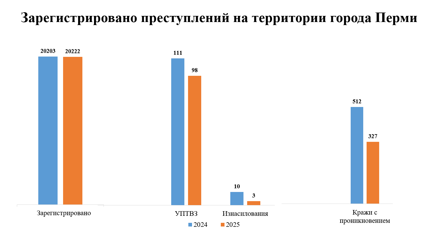 Рассказывая о результатах деятельности городской полиции, Стрижков отметил, что всего за 2025 год на территории Перми было зарегистрировано 20 222 преступления, а годом ранее — 20 203. При этом резко снизилось количество зарегистрированных изнасилований: в 2025 году их было три, а в 2024-м — 10.