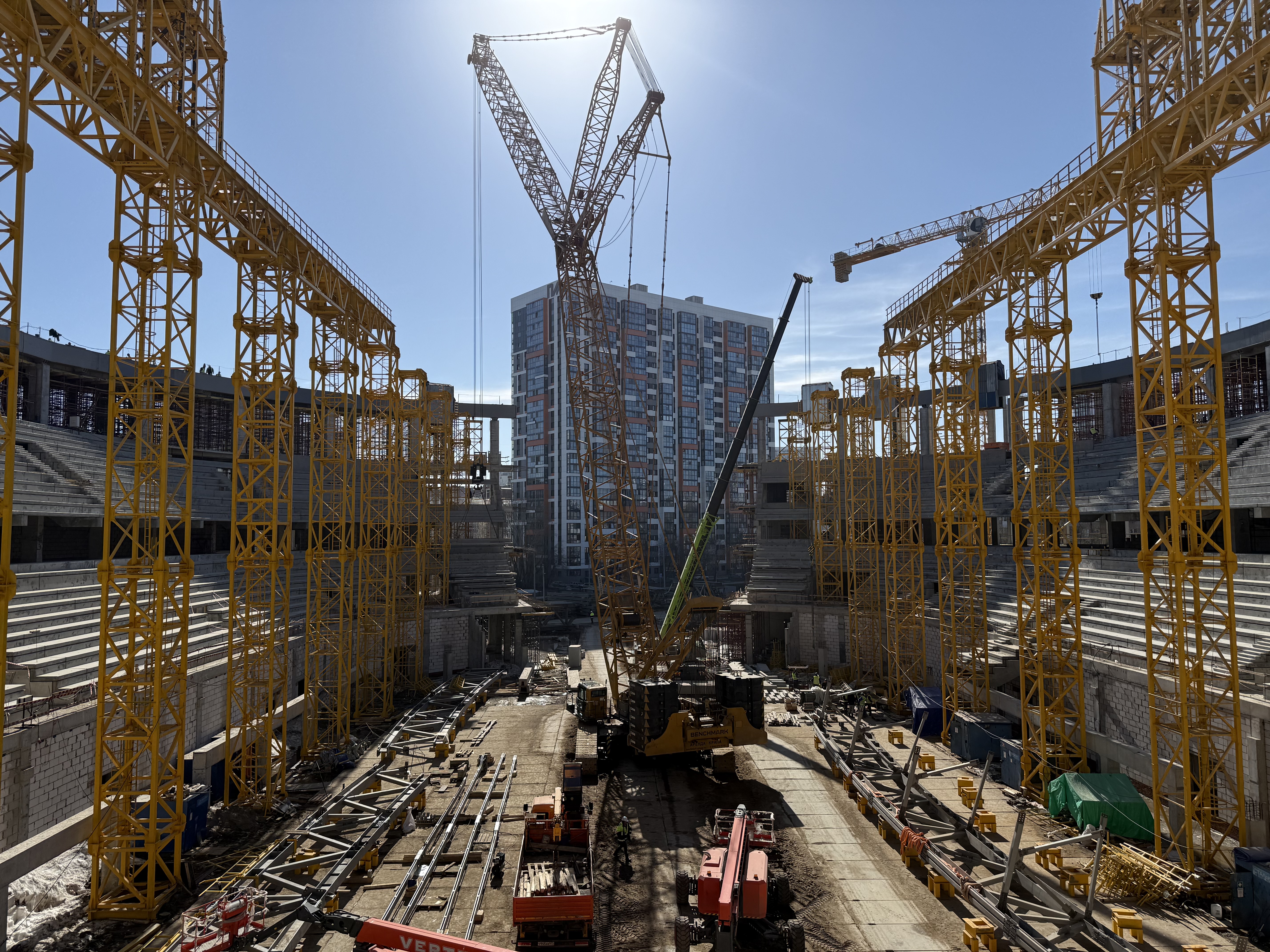 На объекте возводят внутренние стены и перегородки, заливают подготовку под полы, монтируют лестничные клетки и конструкции трибун, а также ведут работы по устройству внутренней вентиляции и выпусков канализации. На данный момент смонтирован тестовый участок облицовки здания.