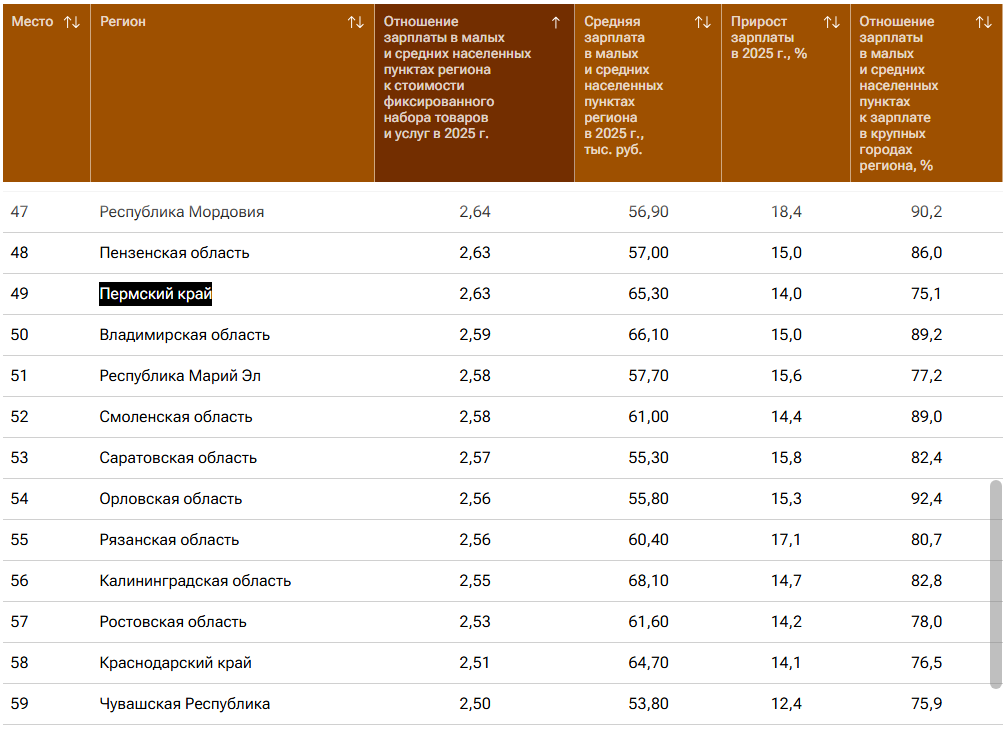 Аналитики рассчитали отношение зарплаты в провинциях региона к стоимости фиксированного набора товаров и услуг и составили общий рейтинг. Прикамье оказалось на 49-м месте с показателем 2,63, потеряв с прошлого года четыре строчки. Лидерами остались Ненецкий АО (5,56), Ямало-Ненецкий АО (5,46) и Магаданская область (5,46), аутсайдерами — Чеченская Республика (1,41), Республика Ингушетия (1,63) и Республика Дагестан (1,77).