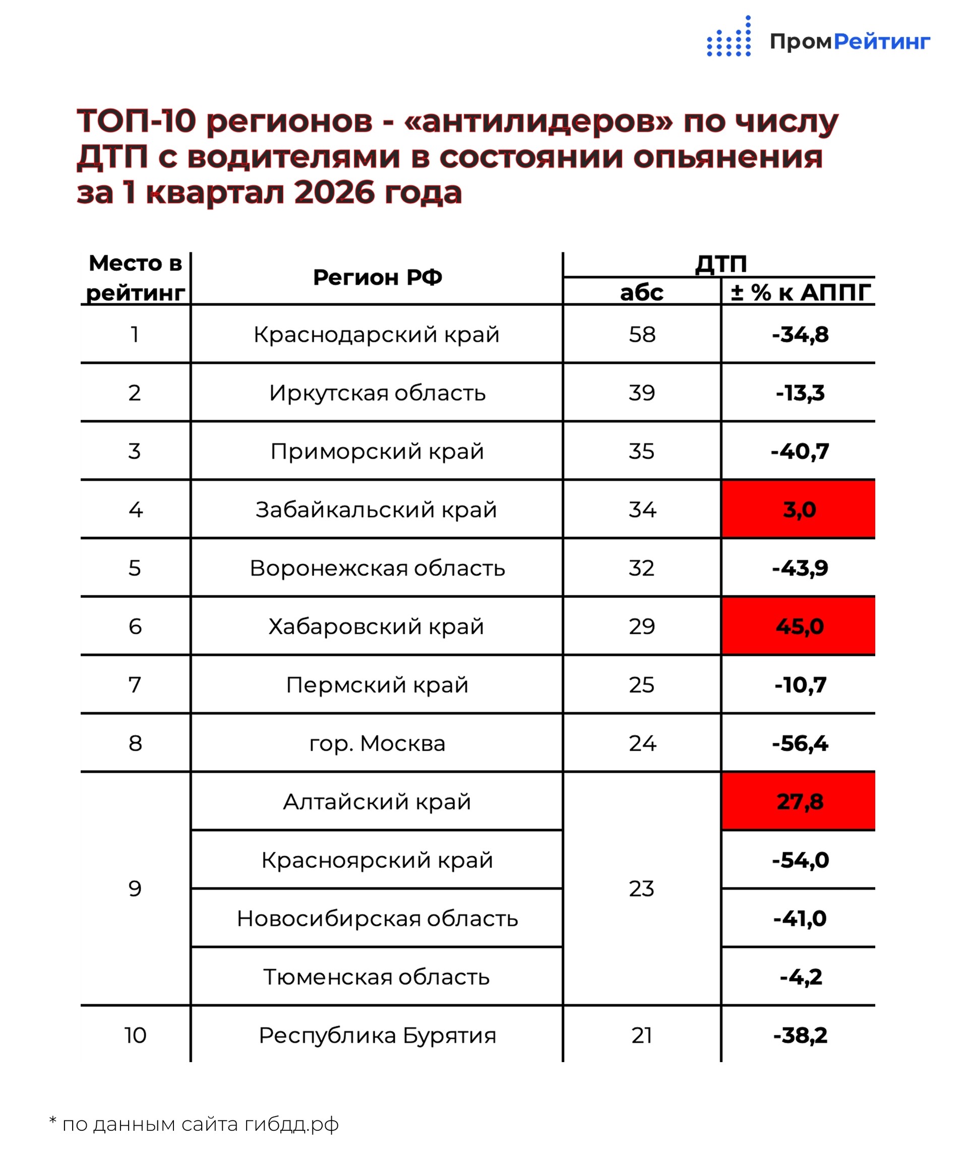 Пол итогам первого квартала 2026 года Пермский край вошёл в топ-10 регионов-антилидеров по числу ДТП, произошедших с водителями в нетрезвом состоянии. Рейтинг составило исследовательское агентство «ПромРейтинг» на основании данных ГИБДД.
