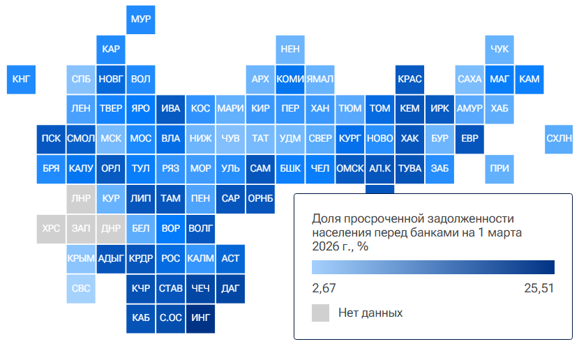Наименьшая доля просроченных долгов оказалась у жителей Севастополя — 2,67%, Крыма — 3,16% и Санкт-Петербурга — 3,23%. Москва заняла шестое место (3,48%), Свердловская область — 20-е (4,08%).