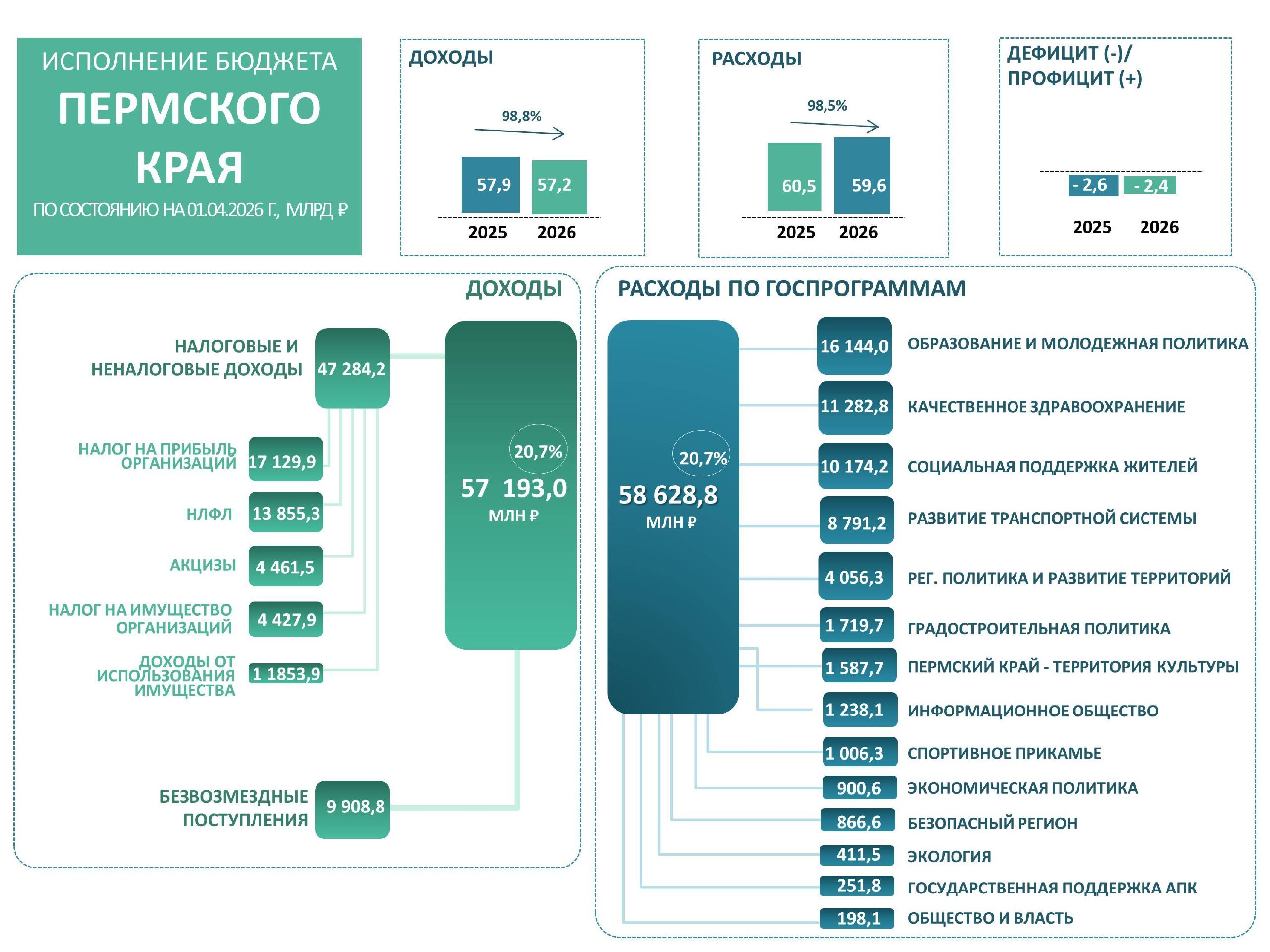 В бюджет Пермского края за первый квартал 2026 года поступило 57,2 млрд руб., что составляет 20,7% от годового плана. Сумма расходов составила 59,6 млрд руб. (19,8% от плана). Таким образом, по итогам периода в бюджете сложился дефицит в объёме 2,4 млрд руб.