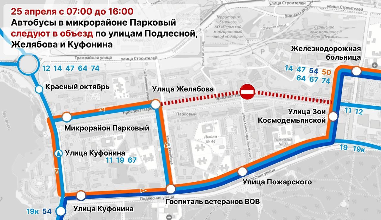 Автобусы маршрутов № 11, 12, 14, 19, 47, 50, 54, 64, 67 и 74 направят в объезд по ул. Зои Космодемьянской, Подлесной и Желябова. Пассажирам советуют пользоваться остановками на ул. Подлесной. Возможны отклонения от расписания.