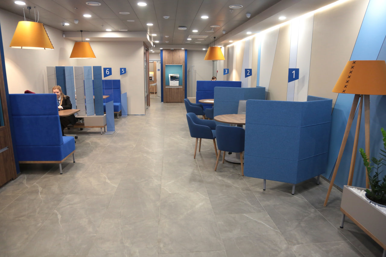 Интерьер нового офиса выполнен в современном дизайне. Пространство разделено на функциональные зоны, включая пространства для ожидания и отдельную переговорную комнату для конфиденциальных встреч. В новом отделении взаимодействие между сотрудниками и клиентами проходит за круглым столом или на удобных мягких диванах, что создаёт атмосферу доверия и открытости.