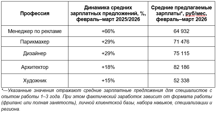 Креативные профессии с наибольшим приростом средних зарплатных предложений за год (февраль-март 2025/26):