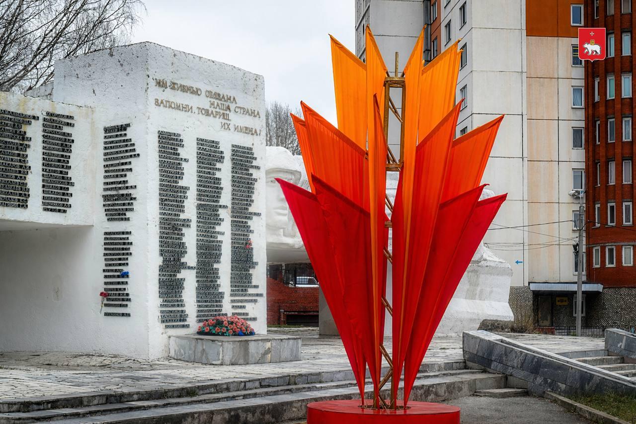 Часть конструкций уже установлена в разных районах Перми. Например, перед цирком появилась флаговая композиция «Победа», у монумента «Героям фронта и тыла» — декорация «Вечная память» и конструкция «Пламя подвига». Рядом с филармонией разместили звезду, а на набережной Камы — консоль «Родина-мать». Также праздничное оформление появилось у Дома молодёжи и на Октябрьской площади.